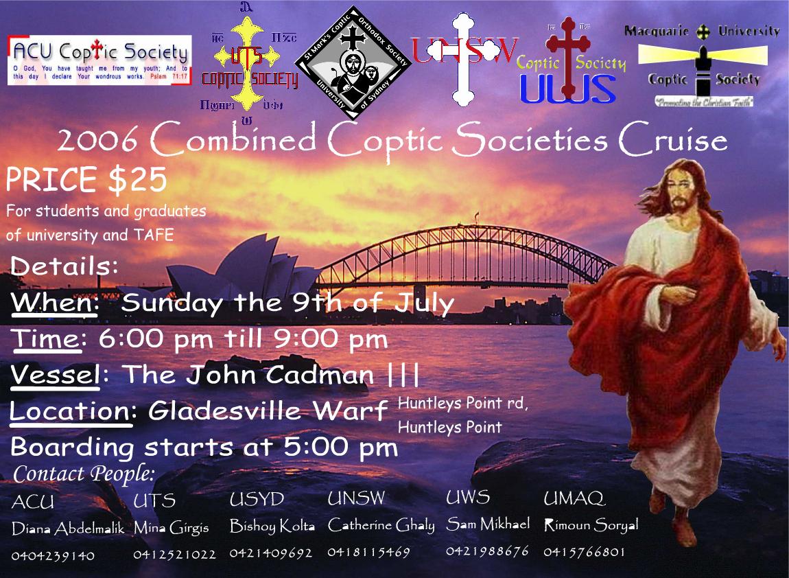 There is a the cruise for ALL Coptic Societies in Universities and Tafes. Also including graduates. It's Sunday, the 9th of July, so exams are over... NO EXCUSE!